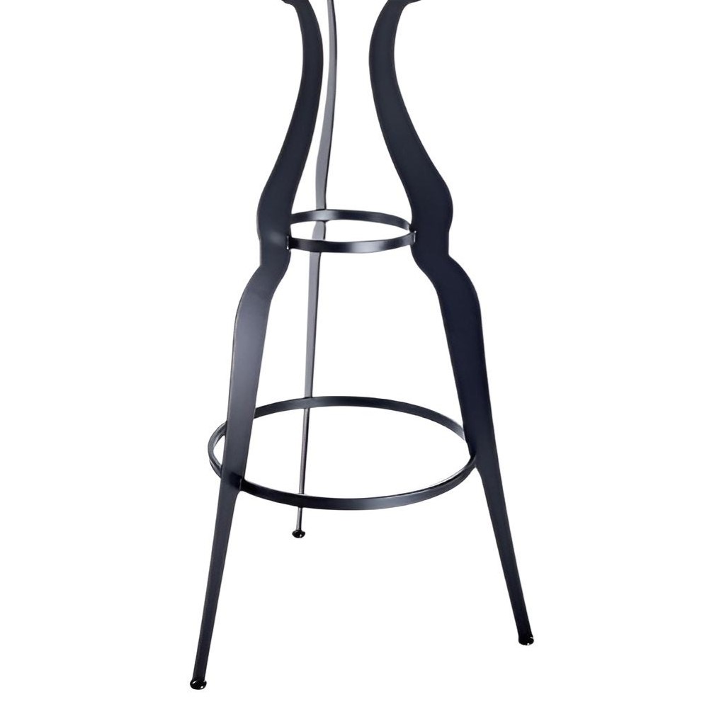 Romantico e classicheggiante, arreda ambienti interni ed esterni. Struttura in acciaio verniciato con polveri poliuretaniche, a tre o quattro gambe per ospitare piani tondi e quadrati in stratificato colorato. Disponibile anche la versione poseur table da 1100 mm di altezza.