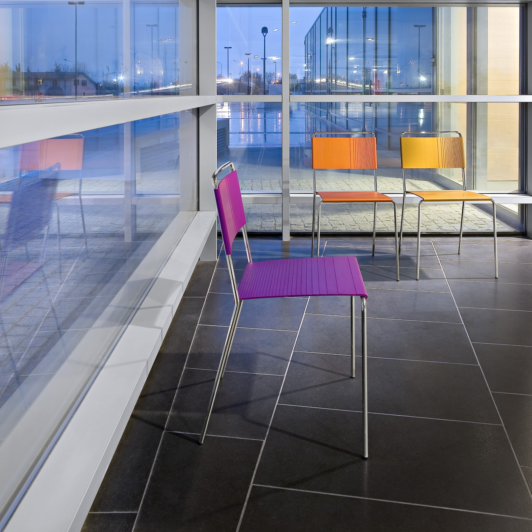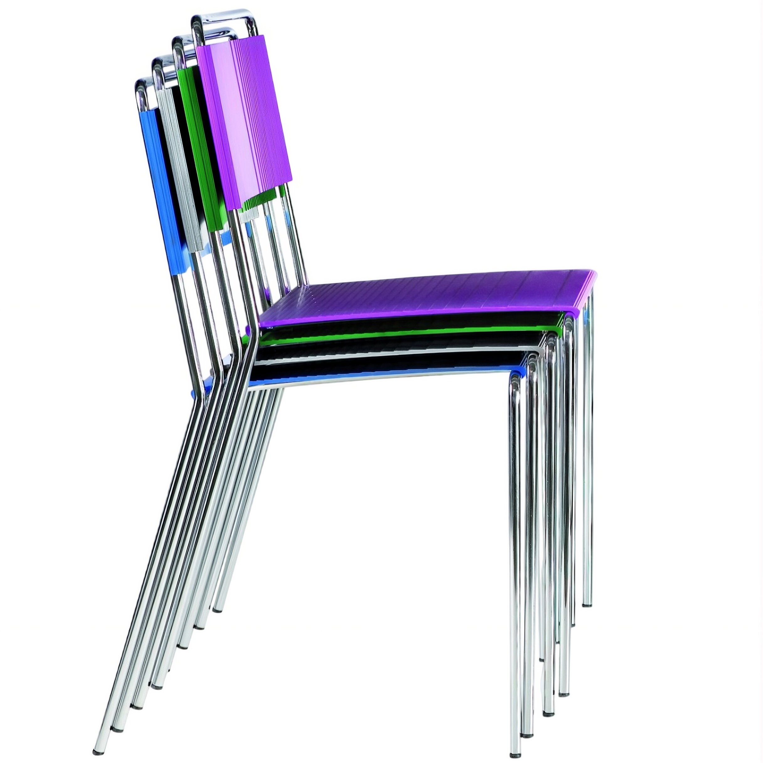 Questa sedia a quattro gambe combina un design essenziale a una spiccata personalità cromatica, grazie alla seduta in alluminio anodizzato e alla solida struttura in acciaio cromato.