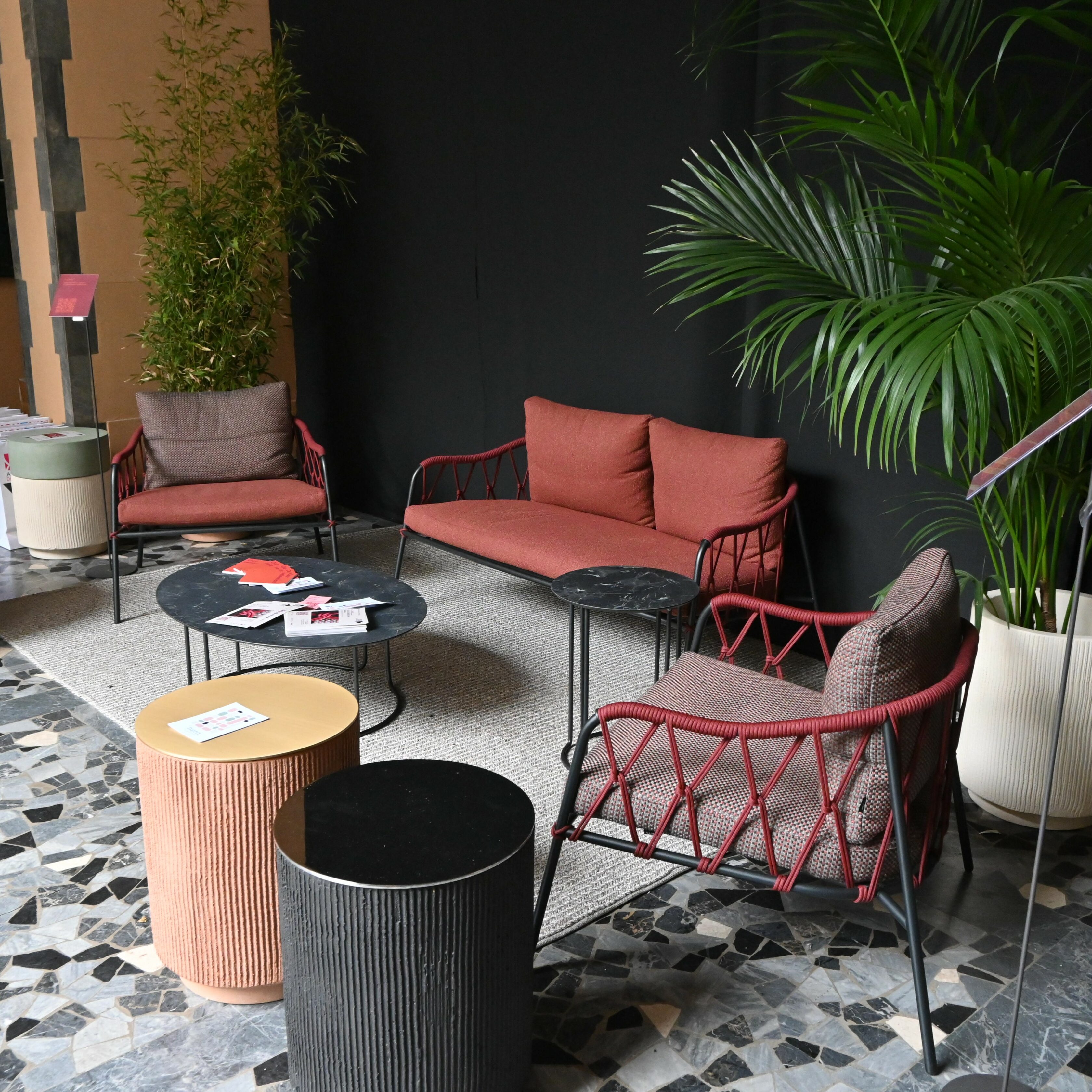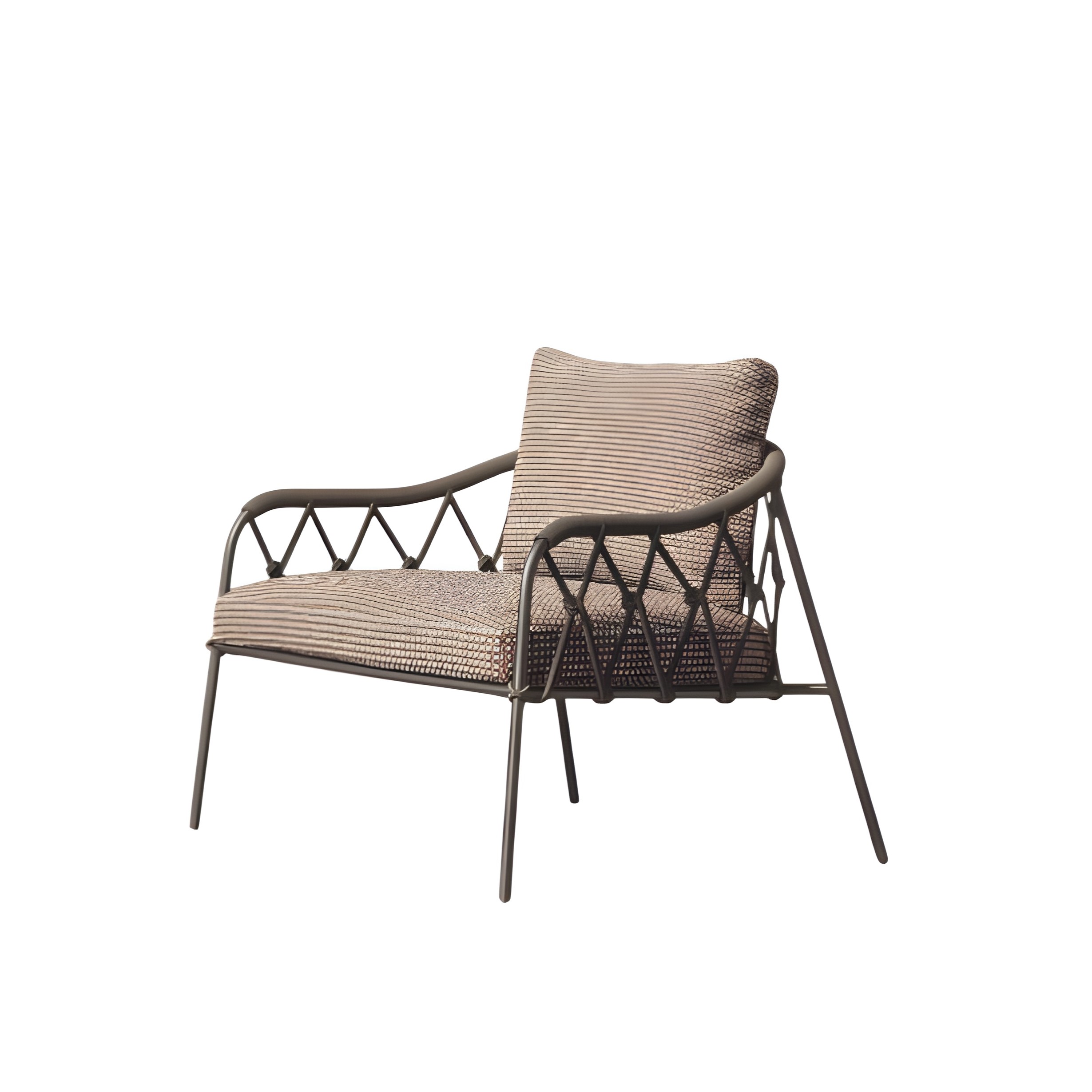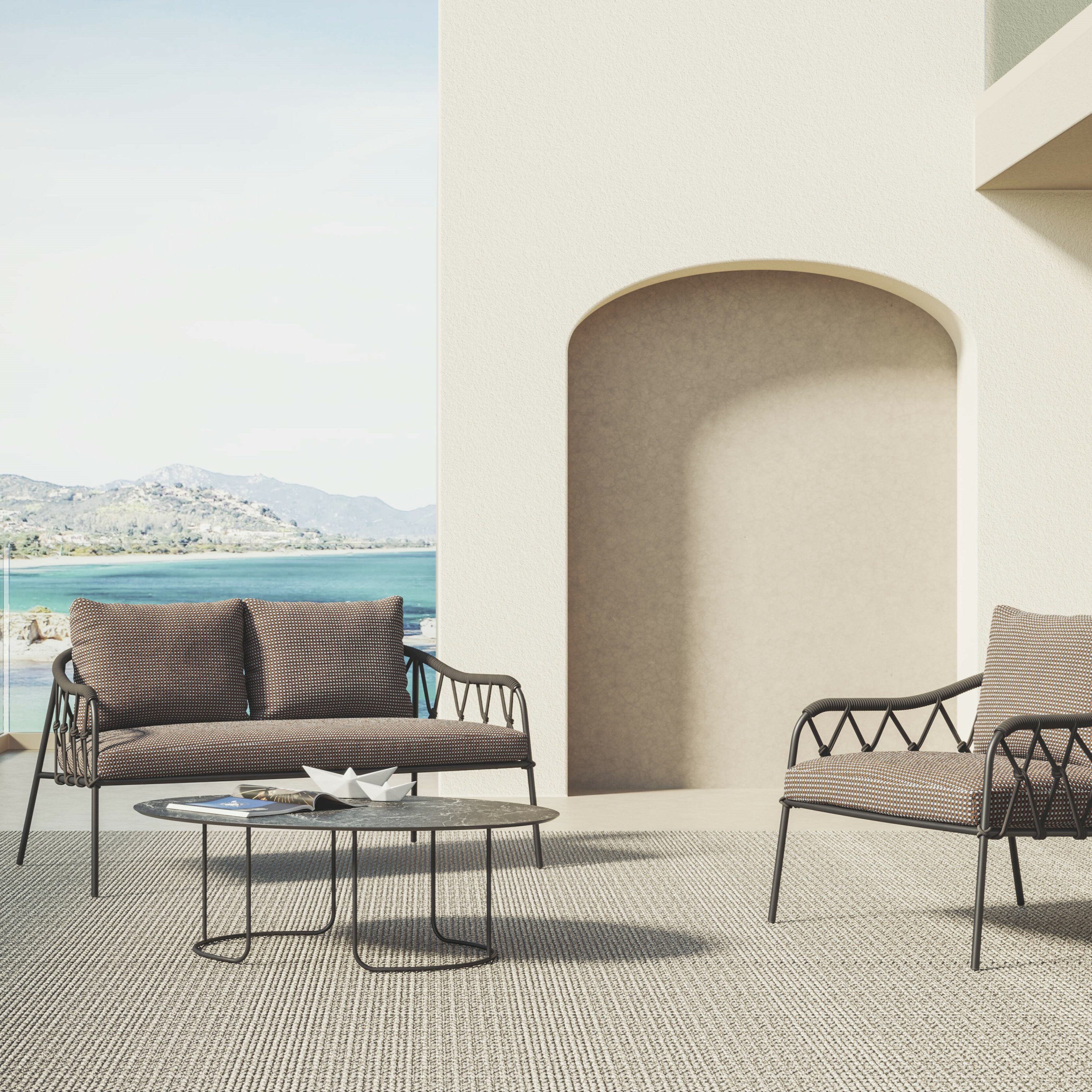 Progettata per trasformare l’ambiente esterno in una vera estensione della zona living, la Poltrona Scala Outdoor è un perfetto equilibrio tra ergonomia e durabilità. Il fulcro del design è lo schienale curvo che non solo dona un aspetto lussuoso e dinamico, inoltre le corde che decorano la struttura stessa sono realizzate con tessuti tecnici drenanti e resistenti ai raggi UV. La struttura in metallo trattato, dal profilo sottile ma robusto, incornicia la seduta con un segno grafico minimale, assicurando stabilità su ogni tipo di superficie esterna.